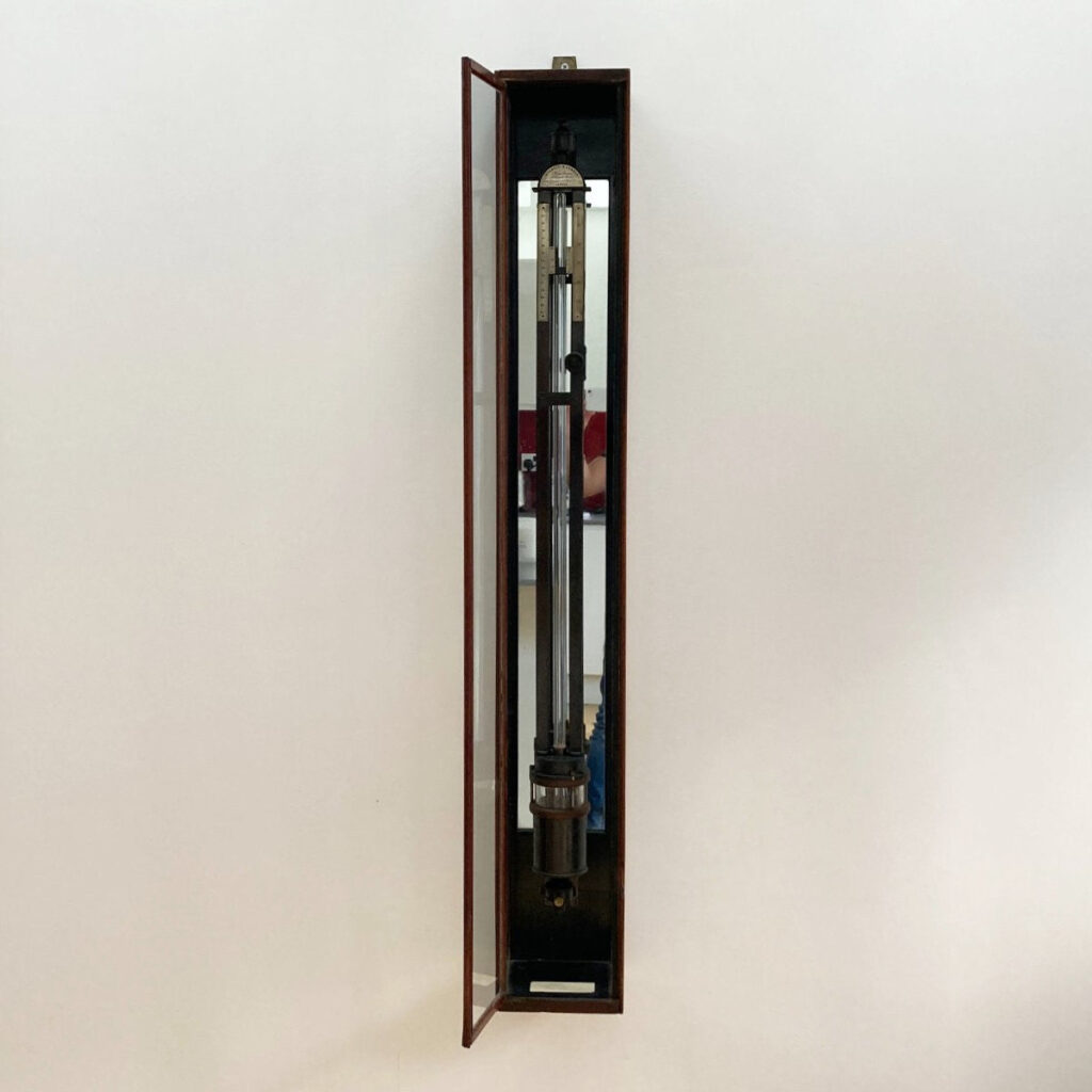 Another similarly aesthetic barometer was also developed during the early part of the decade, the long range glycerine and mercury barometer was intended to allow for more precise reading of atmospheric pressure by using an extended scale. It was described as follows: