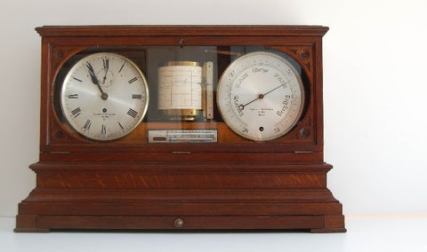 The company were also responsible for the invention of the “Self-Recording Aneroid Barometer” as it became known. The result was a large cased instrument which included a fusee pendulum clock and a large aneroid barometer. To the centre of the instrument was provided a large brass drum which included a paper graph and a pen. All three elements were closely connected, the clock drove the drum and also regulated the intermittent engagement of the pen to the graph. It also enabled a small tap which was applied to the barometer prior to the pen’s engagement and ensured the barometer was reading correctly. The barometer itself was connected to the pen arm and would regulate the pen movement in line with the pressure reading on the barometer which would then be transferred to the graph.