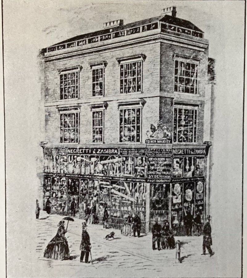 The 1850’s were a prolific period for Negretti & Zambra, their cash books from the first half of the decade show that they were now supplying many of the older and more established Italian émigré London businesses such as Tagliabue, Pini, Ronchetti, Pastorelli and even the Casella business which had been formed following the death of Angelo Tagliabue (Negretti & Casella’s former master) in 1844. It is also notable how many established English businesses they were supplying, many of which were co-exhibitors at the Exhibition such as Smith & Beck, Horn & Thornwaite & Carpenter & Westley. Regional businesses such as JB Dancer, Abraham, Chadburn, Gardner & J Davis & Son were also trade customers. The image below shows an engraving of the early Negretti premises at 11 Hatton Garden proudly showing the Royal Appointment at the door and if it’s not artistic licence, the amount of product on display was almost incomprehensible!